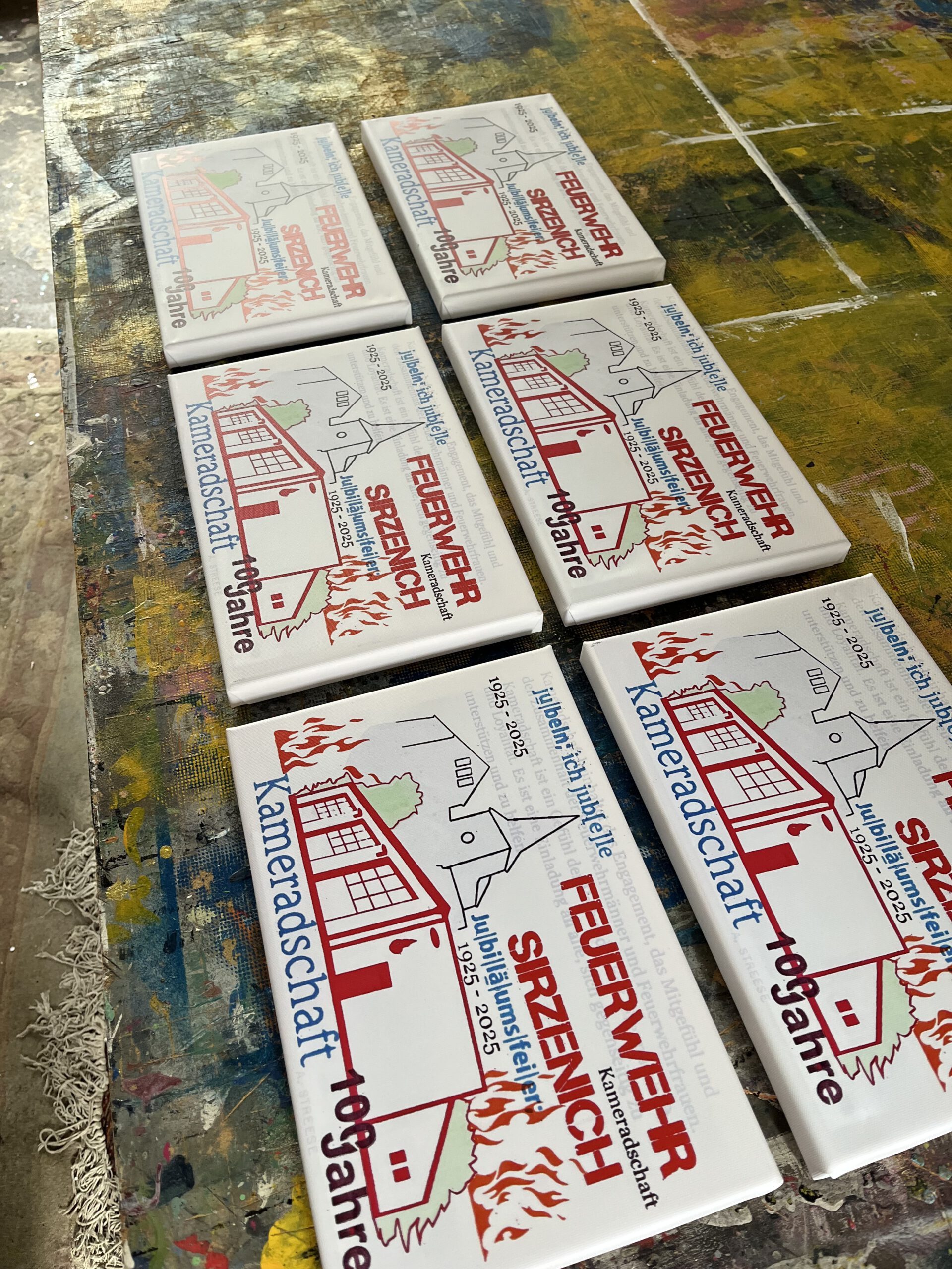 Anlässlich des 100-jährigen Jubiläums der Feuerwehr Sirzenich (1925–2025) entstand in enger Zusammenarbeit ein besonderes künstlerisches Projekt, das bewusst neue Wege ging. Statt der üblichen Jubiläumsgeschenke wie Wimpel, Biergläser oder klassische Werbeartikel erhielt jeder eingeladene Feuerwehrverein ein individuell gestaltetes kleines Kunstwerk aus meiner Hand.
