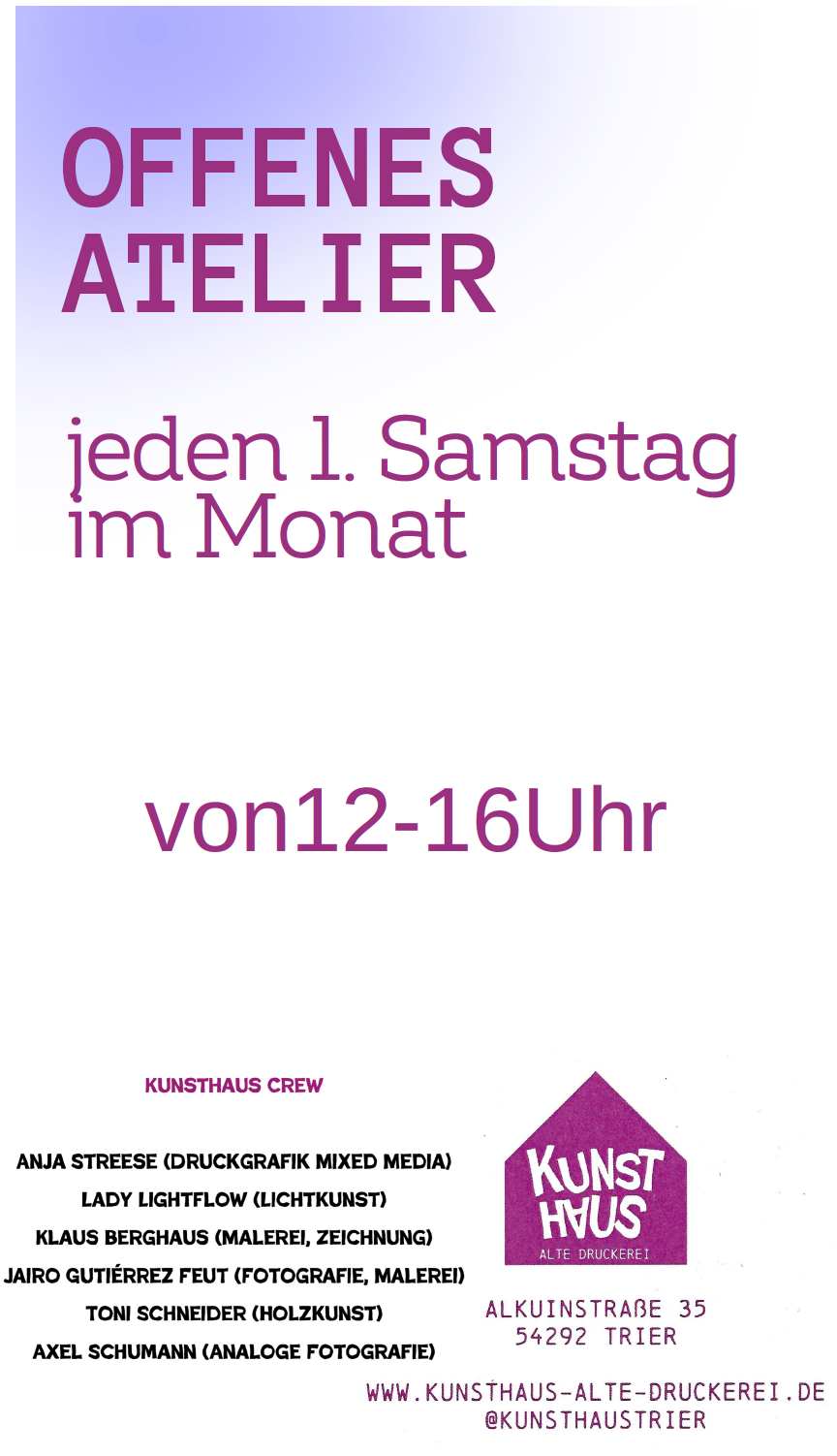Ab 2026 öffnet das Kunsthaus-Künstlerteam jeden ersten Samstag im Monat von 12 bis 16 Uhr die Türen für dich.