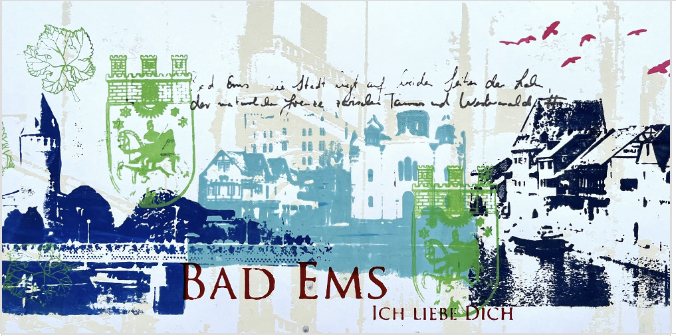 Dieses poetische Kunstwerk von Bad Ems interpretiert die traditionsreiche Kurstadt in einer vielschichtigen, zeitgenössischen Bildsprache. Historische Architektur, Stadtansichten und Wappenmotive verbinden sich mit freien Linien, Schriftfragmenten und Farbflächen zu einem atmosphärischen Stadtporträt von Bad Ems. Der Schriftzug „Ich liebe dich“ verleiht dem Werk eine persönliche, emotionale Tiefe.
