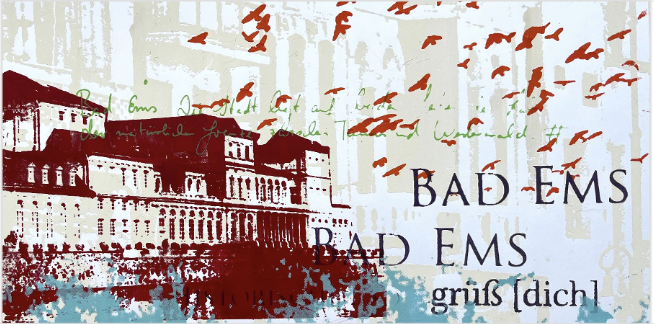 Das auf dem Original-Siebdruckkunstwerk abgebildete Motiv zeigt die historischen Thermen von Bad Ems nicht dokumentarisch, sondern in einer vielschichtigen, künstlerischen Interpretation. Architekturfragmente, Schriftzüge und freie Farbspuren überlagern sich zu einem atmosphärischen Stadt- und Kulturporträt, das die Bedeutung des Kurortes zwischen Geschichte, Gesundheit und europäischem Kulturerbe sichtbar macht.