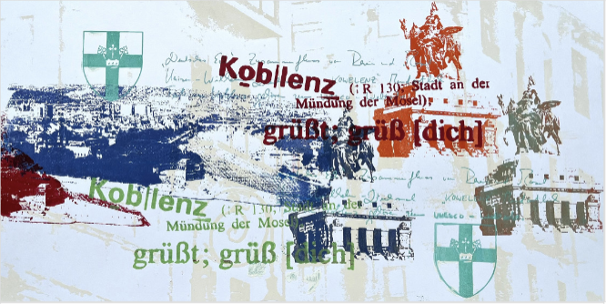 Dieses vielschichtige Kunstwerk von Koblenz interpretiert die Stadt als historisch gewachsenen Ort an der Mündung der Mosel in den Rhein. Typografische Elemente, Stadtfragmente, Wappenmotive und architektonische Strukturen überlagern sich zu einem lebendigen Stadtporträt von Koblenz. Schriftzüge wie „Koblenz grüßt dich“ verleihen dem Motiv eine persönliche, beinahe poetische Ebene.