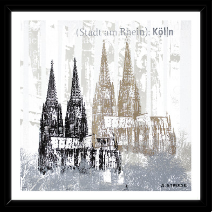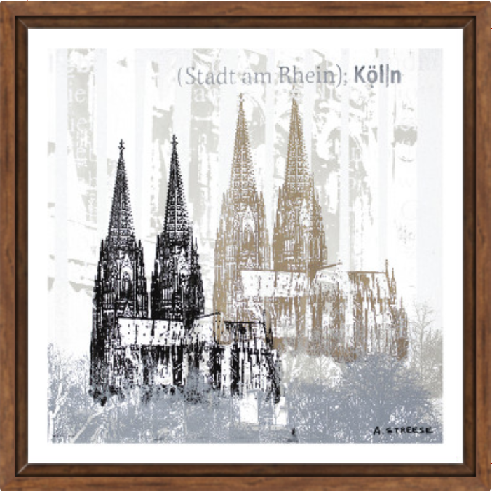 Dieses ruhige und zugleich ausdrucksstarke Köln Kunstwerk zeigt den Kölner Dom in einer vielschichtigen, grafischen Interpretation. Überlagerte Strukturen, reduzierte Farben und feine Druckspuren lassen das Motiv wie eine Erinnerung an die Stadt am Rhein wirken – zeitlos, modern und voller Atmosphäre.