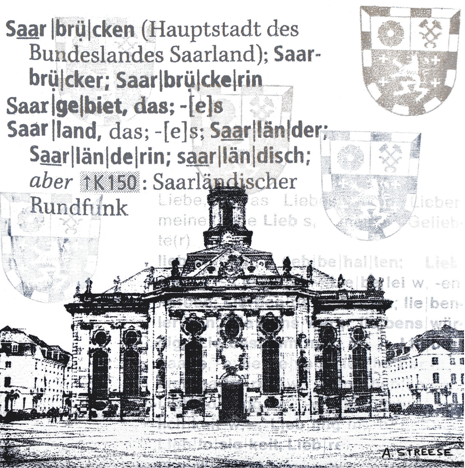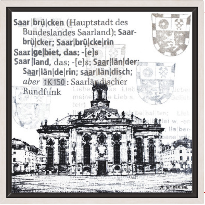Dieses Kunstwerk zeigt die Ludwigskirche in Saarbrücken, die Hauptstadt des Saarlandes, in einer charakteristischen und zeitlosen Darstellung. Im Mittelpunkt steht die markante Architektur der Stadt, kombiniert mit typografischen Elementen und dem Stadtwappen, das Identität, Geschichte und Zusammengehörigkeit symbolisiert.