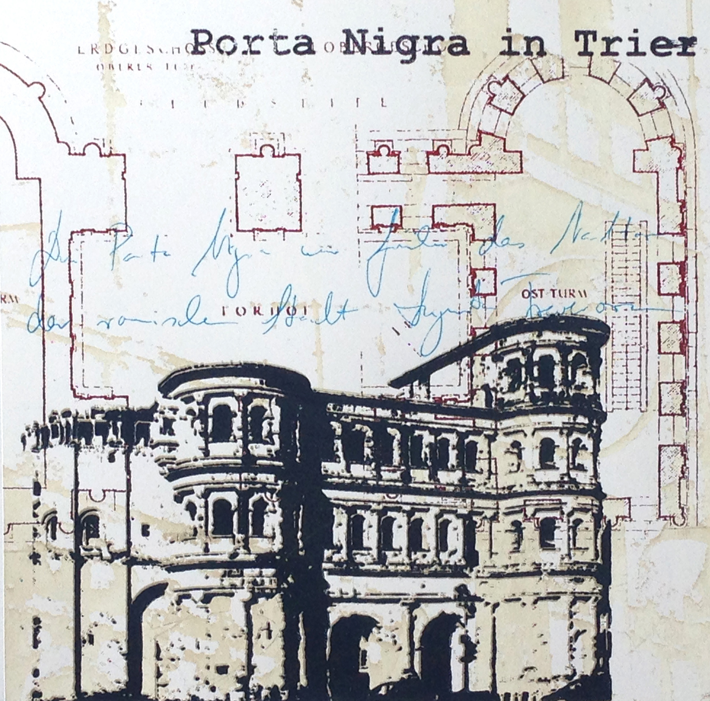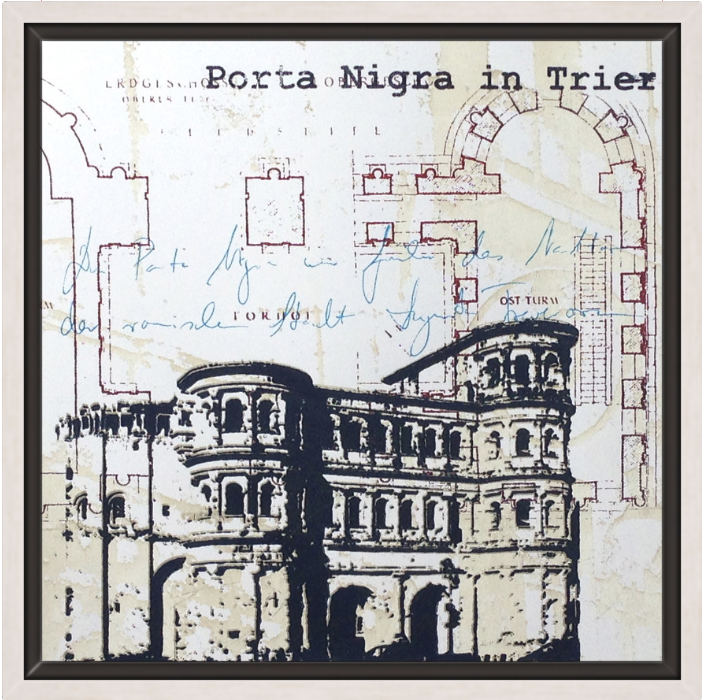 Dieses Motiv zeigt die Porta Nigra in einer reduzierten, grafisch geprägten Bildsprache. Historische Architektur, fragmentierte Grundrisszeichnungen und handschriftliche Notizen überlagern sich zu einer vielschichtigen Komposition, die Vergangenheit und Gegenwart miteinander verbindet. Die Darstellung wirkt bewusst zurückgenommen, ruhig und strukturiert – fast wie ein architektonisches Dokument mit künstlerischer Handschrift.