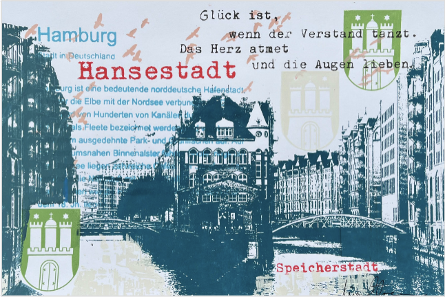 Dieses vielschichtige Hamburg Kunstwerk zeigt die Hansestadt Hamburg in einer poetischen und zugleich urbanen Interpretation. Die ikonische Speicherstadt, Kanäle, Brücken und historische Fassaden verdichten sich zu einer atmosphärischen Stadtansicht von Hamburg. Textfragmente, grafische Ebenen und architektonische Strukturen greifen ineinander und transportieren das besondere Lebensgefühl der norddeutschen Metropole.