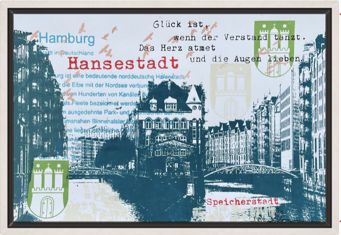 Das Motiv basiert auf einem Original-Siebdruckkunstwerk und ist hier als hochwertiger Fotodruck erhältlich. Die Kombination aus Stadtarchitektur, Typografie und freien Farbspuren verleiht dem Werk Tiefe und Ausdruck. Die Speicherstadt als UNESCO-Welterbe wird nicht dokumentarisch, sondern künstlerisch interpretiert – modern, reflektiert und zeitlos.