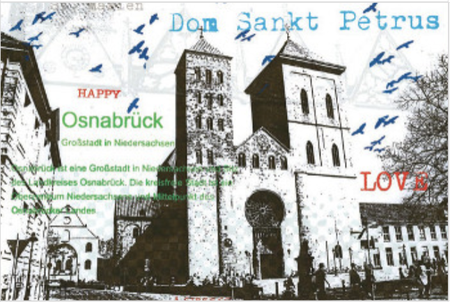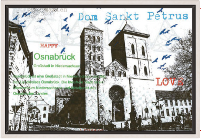 Dieses außergewöhnliche Siebdruck-Kunstwerk zeigt den Dom St. Petrus in Osnabrück, eines der bedeutendsten Wahrzeichen der Stadt und ein Ort voller Geschichte, Spiritualität und urbanem Leben. Der Dom steht sinnbildlich für Osnabrück als Friedensstadt, als kulturelles Zentrum Niedersachsens und als Ort, an dem Vergangenheit und Gegenwart auf besondere Weise miteinander verschmelzen.