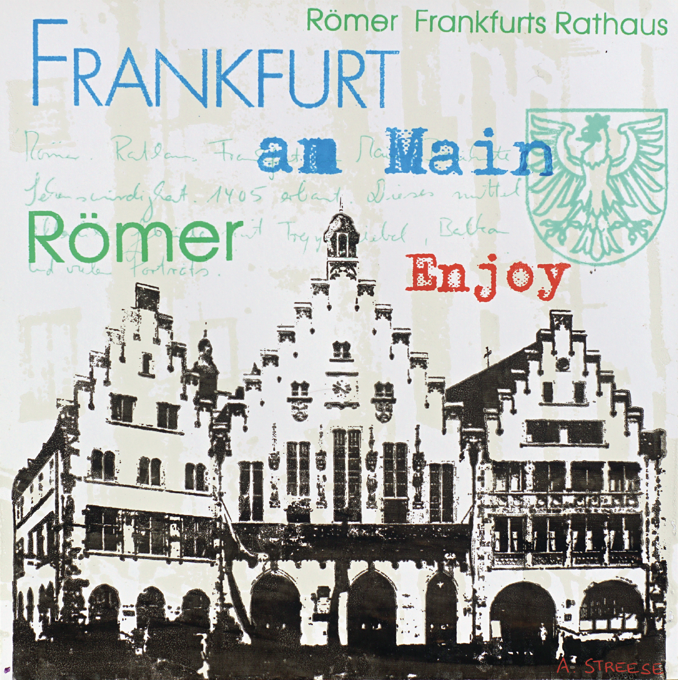 Dieses ausdrucksstarke Kunstwerk zeigt den Römer, das historische Rathaus von Frankfurt am Main, als zentrales Motiv. Typografische Elemente wie „Frankfurt“, „Römer“ und „Enjoy“ verbinden Geschichte, Stadtidentität und moderne Bildsprache zu einem lebendigen Frankfurt Wandbild.