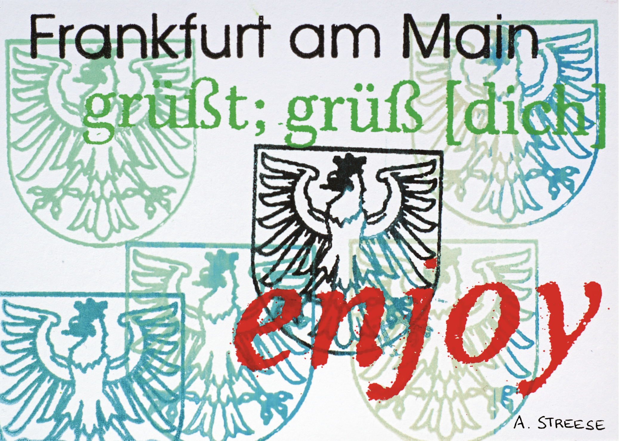 Dieses ausdrucksstarke Kunstwerk verbindet Frankfurt am Main mit einer kraftvollen typografischen Botschaft. Das Frankfurter Stadtwappen steht im Mittelpunkt und wird mehrfach überlagert dargestellt – ein Symbol für Identität, Geschichte und Selbstbewusstsein. Die Worte „Frankfurt am Main grüßt; grüß dich“ und „enjoy“ verleihen dem Motiv eine offene, positive und zeitgemäße Ausstrahlung.