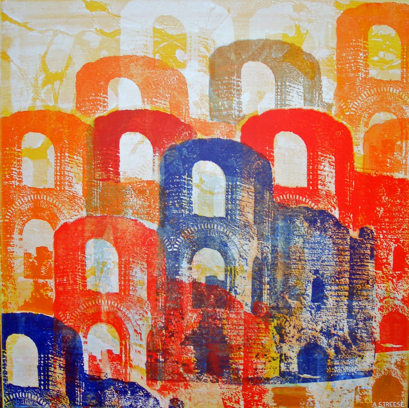 Dieses Motiv interpretiert die Kaiserthermen Trier als kraftvolle architektonische Struktur aus Wiederholung, Farbe und Tiefe. Die charakteristischen Rundbögen werden seriell angeordnet, überlagert und farblich akzentuiert. Warme Rot- und Orangetöne treffen auf kühles Blau und helle Flächen – ein spannungsreicher Dialog zwischen Masse und Leichtigkeit.