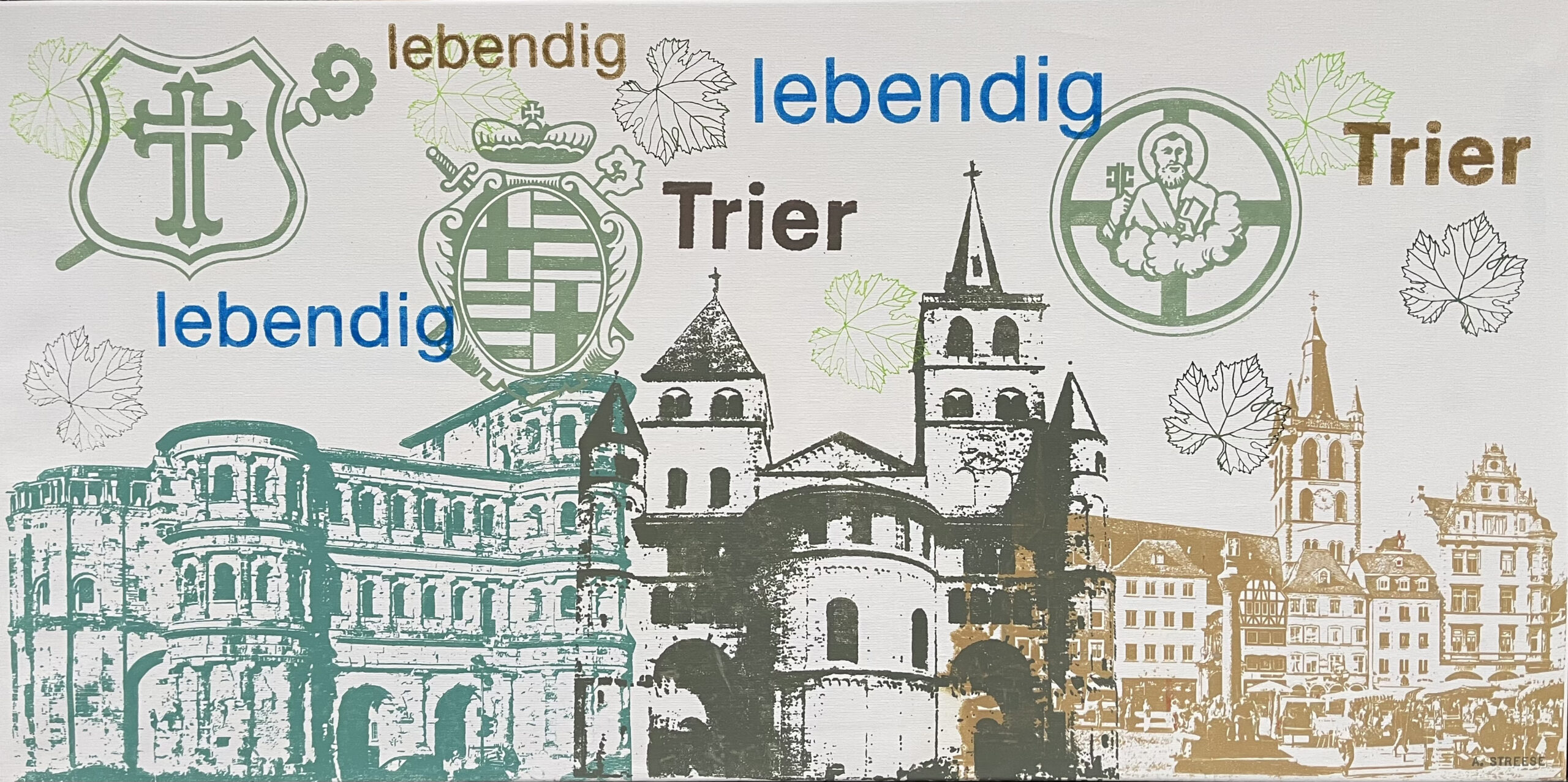 Für die Bischöflichen Weingüter Trier durfte ich eine exklusive Weinetikettengestaltung als Auftragsarbeit realisieren. Ausgangspunkt des Projekts war eine von mir geschaffene Leinwandarbeit, die zentrale Wahrzeichen der Stadt Trier in einer künstlerischen Gesamtkomposition vereint.